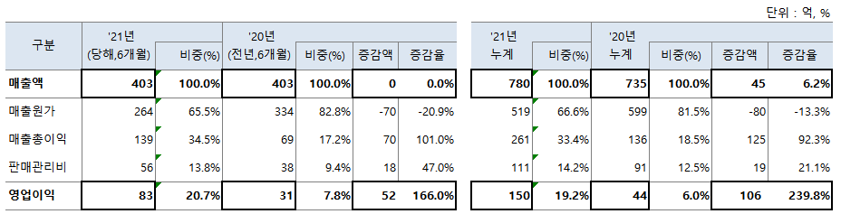 '21년 상반기 매출액은 780억으로 전년비 +45억, 6.2% 성장하였고 영업이익은 150억으로 전년비 +106억 개선하였습니다. 이는 매출원가는 수율 향상으로 80억을 개선하고 매출이익액을 125억(매출성장 +8억, GP개선 +117억) 개선한 결과입니다.