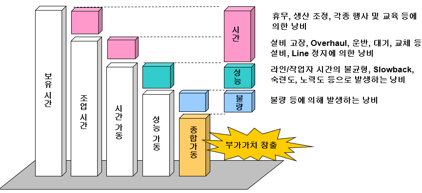 -. Calendar시간(보유시간, 365일 × 24시간)에 생산을 해야 되는 조업시간 기준으로 가치있는 가동시간을 최대한 증가시키는 것이 설비종합효율에서 제일 중요합니다. 그리고 최적으리 품질을 바탕으로 정상적으로 판매할 수 있는 양품율 증가시키는 것이 최고의 원가 경쟁력으로 제조 기업의 이익을 창출 할 수 있습니다.