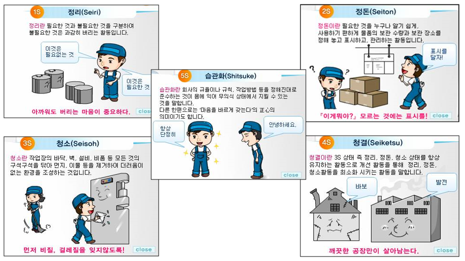 5S의 S는 정리,정돈,청소,청결,질서에서 얻어지는 효용의 머릿말입니다. 5S의 목적은 현장과 관리 모든 상태가 이상이냐 정상이냐를 구분하기 위한 관리수단이며 즉, 문제점을 쉽게 발견 할 수 있도록 하는 관리방법입니다. 환경의 과감한 개선과 변화를 통한 우리의 의식전환의 수단입니다. 고정관념 체계적 관리미흡, 불량과 양품의 관리혼선 등을 유발할 수 있는 작업환경을 제도적으로 바꾸어 그 환경변화에 의식변화를 이끄어내는 수단입니다. 이상과 정상이 구분되지 않은 관리상태를 체게적 정상 관리로의 전환을 통해 관리혼선에서 오는 금전적 손실을 이익으로 전환하는 도구입니다. 다시말하면 규율 있는 작업장, 청결한 작업장, 눈으로 보는 관리 작업장을 만드는 것입니다.
