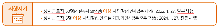 -. 상시근로자 5명 이상 사업장(법인 또는 기관, 개인사업주 모두 포함) : 2024. 1. 27. 전면시행