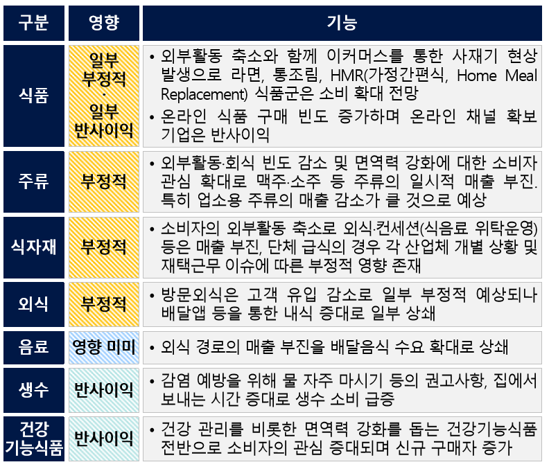 식음료 중 주류·식자재·외식 업종에 대해 부정적 영향으로 매출이 20~30% 급감하고 있으며, 반대로 온라인 식품 구매 확대 및 내식(가정 내 식사) 증대, 식료품 구매 집중으로 인해 일부 라면, 통조림, HMR 등 가공식품과 배달 외식, 건강기능식품의 경우 코로나 19에 따른 직접적 영향은 매출이 적게는 10% 많게는 50% 이상 급등하였습니다.