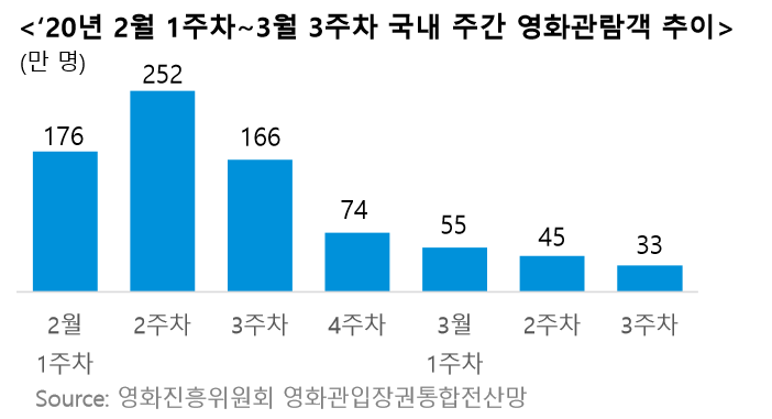 ’ 20년 2월 2주차에 252만 명이었던 국내 주간 영화 관람객은 계속해서 큰 폭으로 하락해, 3월 3주차에는 33만 명까지 감소합니다. 영화진흥위원회에 따르면 ’20년 2월 국내 총 영화관람객은 737만 명, 매출액은 623억 원으로 2004년 이후 16년 만에 최저치를 기록하게 되고 국내 최대의 멀티플렉스 체인인 CGV는 코로나 19로 인한 경영상의 어려움을 극복하기 위해 3월 28일부터 국내 35개 지점의 영업을 중단하게 되었습니다.