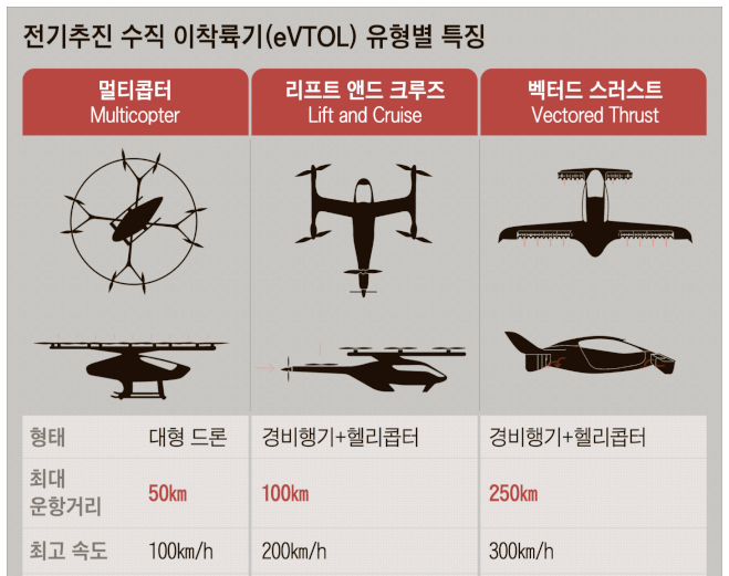전기추진 수직 이착륙기(eVTOL, electric Vertical Take Off&Landing) 종류(유형)은 멀티콥터, 리프트 앤드 크루즈, 벡터드 스러스트가 있습니다.