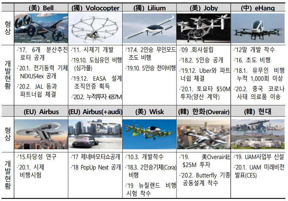 이에 항공기술을 선점한 항공업계((항공) 보잉, 에어버스, 벨 등)부터 대규모 양산이 가능한 자동차((자동차) 현대차, 도요타, 아우디, 벤츠) 업계까지 200여개 업체가 기체 개발에 진출 투자 확대 중이며 우리나라의 서울은 UAM 실현 유망도시인 전 세계 75개 도시 중 헬리포트(1위), 인구밀집도 (5위), 소득수준(4위) 등 높은 수준의 경쟁력 평가(’18, NEXA UAM Report)을 받았다고 합니다. 특히, 모빌리티 플랫폼 전문회사인 Uber는 기체개발 금융 건설 등 다양한 업계와 협력관계를 형성(Elevate Summit)해 이슈 선도하고 있습니다.