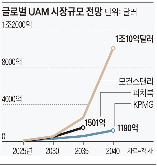 시장조사업체 피치북은 전세계 UAM 시장 규모가 2025년 15억달러(약 1조8000억원)에서 2035년 1510억달러(약 183조원)로 10년간 100배 넘게 성장할 것으로 보고있습니다.