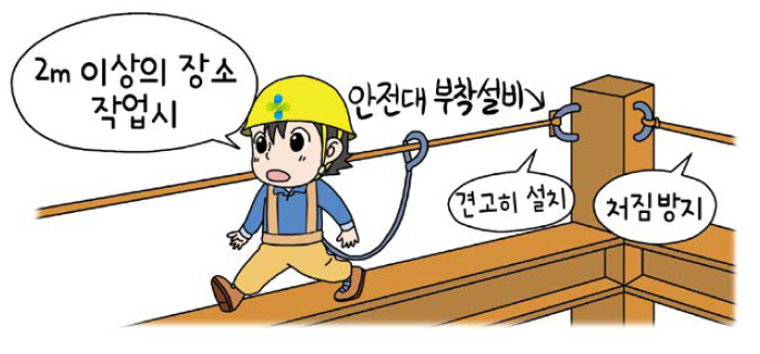 - 2m 이상의 장소에는 안전대를 부착할 안전대 부착 설비를 설치하여야 하고,