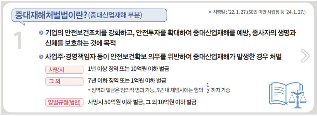 중대산업재해 처벌법이란? ①기업의 안전보건조치를 강화하고, ②안전투자를 확대하여 중대산업재해를 예방, ③종사자의 생명과 신체를 보호하는 것에 목적으로 사업주·경영책임자 등이 안전보건확보 의무를 위반하여 중대산업재해가 발생한 경우 처벌을 받습니다.