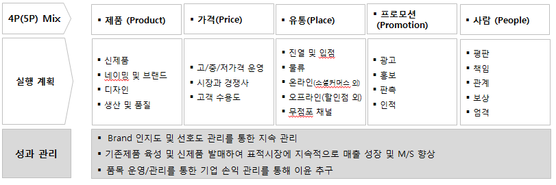 - 제품 (Product), 가격(Price), 유통(Place), 프로모션(Promotion), 사람 (People)