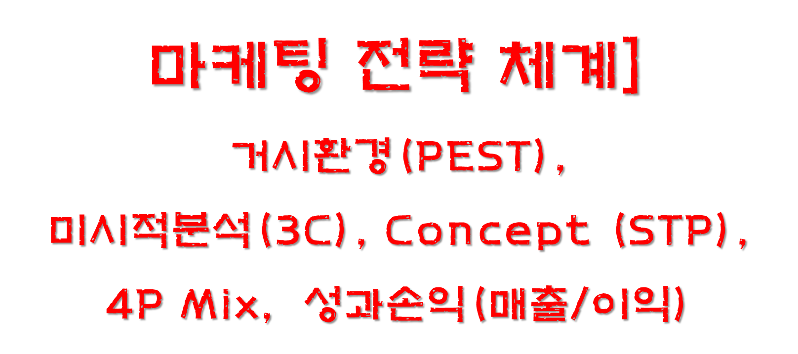 마케팅이란? 기업(생산자)이 이윤을 목적으로 상품 또는 서비스를 소비자에게 유통시키는 데 관련된 모든 체계적 경영활동을 말하는 것으로 거시환경(PEST분석), 3C분석(미시분석), Concept, STP전략, 4P전략, 손익관리 등등등... 말합니다.