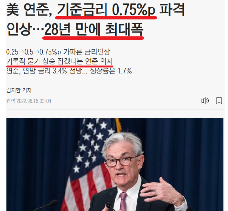 최근 미국 FOMC(미국 연방공개시장위원회)에서 자이언트 스텝 75bp 기준금리를 전격적으로 인상했습니다. 이를 우리는 "자이언트 스텝"이라고 표현합니다. 25bp를 베이비스텝, 50bp를 빅스텝이라고 하는데 자이언트 스텝은 듣지도 보지도 못한 표현이라고 합니다. 거의 25년~30년 만에 진행한 큰 사건입니다.