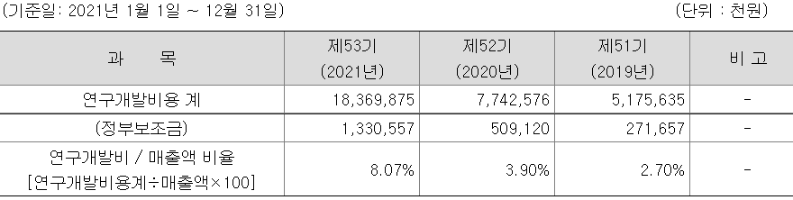 매출액 대비 연구개발비의 비율은 정부보조금을 차감하기 전의 연구개발비용 지출총액을기준으로 산정금액입니다. 전체 매출액의 8.07% 연구비로 집행하고 있습니다.