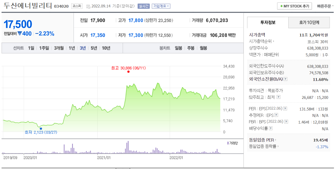 그런데 지금 두산에너빌리티의 주가는 17,500원으로 단기 저점을 기록하고 있습니다.