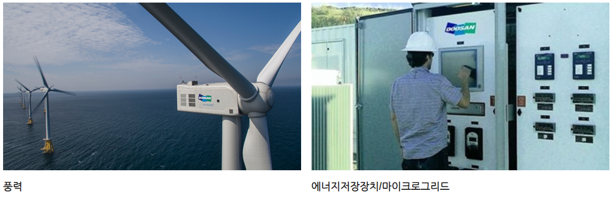 4] 신재생 에너지 : 풍력, 태양광 등 화석연료가 아닌 에너지원을 사용하는 발전시스템, 에너지저장장치와 마이크로그리드 등 에너지 효율을 극대화 시키는 기술 등을 중점 개발하며 깨끗한 지구를 만들기 위해 노력하고 있습니다. 특히, 풍력은 발전설비 전문 업체로서 40여년의 축적된 노하우와 세계적 수준의 우수한 풍력 연구인력을 바탕으로 WinDS3000, 3300 및 WinDS5500을 개발 하였습니다. 또한 WinDS8000+ 대용량 모델 개발 추진을 통해 지속가능한 경쟁력 확보를 위해 노력하고 있습니다. 이와 더불어 두산중공업 풍력발전시스템은 높은 신뢰성과 신속하고 편리한 유지 보수 및 서비스를 제공합니다.
