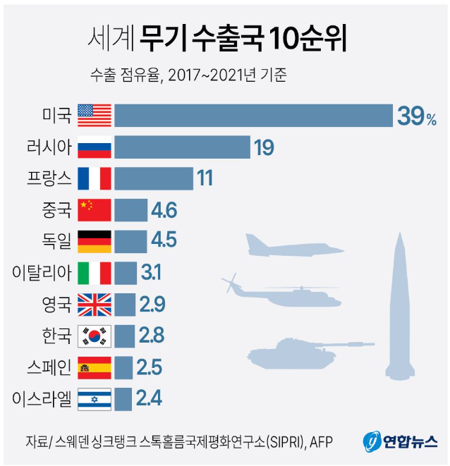 미국은 51%, 중국 18%, 영국 6.8%, 프랑스 4.9% 등을 기록했고, 이스라엘 2.0%, 독일 1.6%, 일본 1.5% 등이었다. 다만 이는 100위 안에 든 기업만을 기준으로 집계한 수치여서 각국의 방산시장 점유율과는 다소 차이가 있다. SIPRI도 과거 발간한 보고서에서 2017∼2021년 세계 방산 수출시장에서 한국의 점유율은 2.8%로 8위라고 밝힌 바 있다.