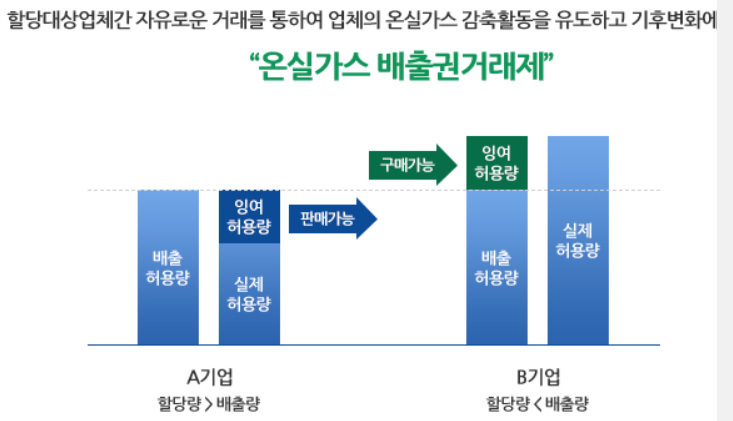 온실가스 배출권거래제란 정부가 온실가스를 배출하는 사업장을 대상으로 연단위 배출권 할당하여 할당범위 내에서 배출행위를 할 수 있도록 하고, 할당된 사업장의 실질적 온실가스 배출량을 평가하여 여분 또는 부족분의 배출권에 대하여는 사업장간 거래를 허용하는 제도입니다.