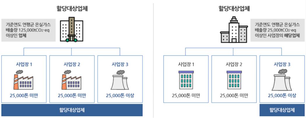 계획기간 4년 전부터 3년간 온실가스 배출량 연평균 총량이 125,000톤 이상 업체 또는 25,000톤 이상 사업장의 해당업체와 자발적으로 할당대상업체로 지정 신청을 한 업체이며, 관리대상물질은 이산화탄소(CO2), 메탄(CH4), 아산화질소(N2O), 수소불화탄소(HFCS), 과불화탄소(PFCS), 육불화황(SF6) 6가지 항목입니다. 할당방식은 과거배출량 기반 할당(GF, Grandfathering)과 과거활동자료 기반 할당(BM, Benchmark)으로 구분됩니다.
