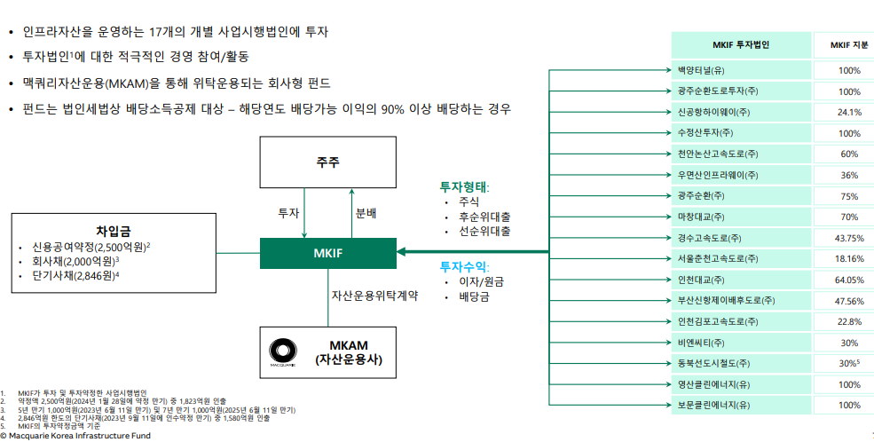 맥쿼리한국인프라투융자회사(이하 "MKIF")는 사회기반시설에 대한 민간투자법(이하 "민투법")에 의해 설립된, 대한민국을 선도하는 국내 최대 규모의 상장 인프라 펀드입니다.