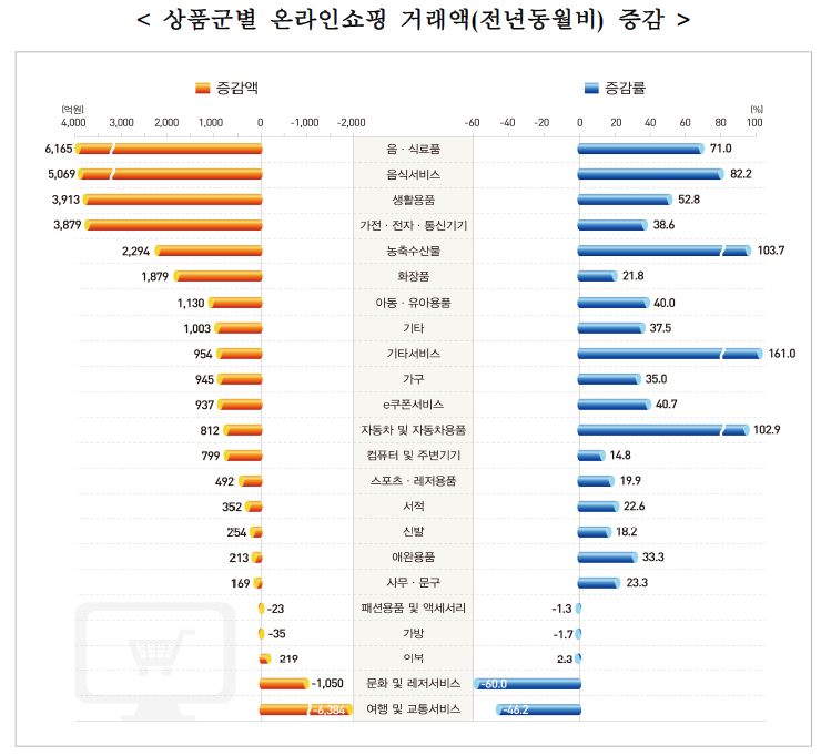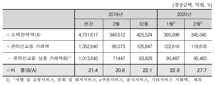 - 2020년 2월 세부 상품군별 온라인 쇼핑 거래액은 전년 동월 대비 문화 및 레저서비스(-60.0%), 여행 및 교통서비스(-46.2%) 등에서 감소했으나, 음식서비스(82.2%), 음·식료품(71.0%), 생활용품(52.8%) 등에서 증가되었습니다.