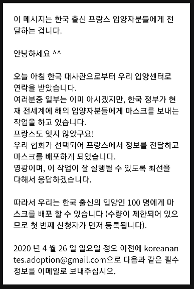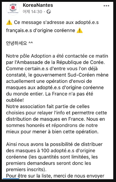 "Le gouvernement Sud-Coréen mène actuellement une opération d'envoi de masques aux adopté.e.s d'origine coréenne du monde entier. La France n'a pas été oubliée!"(한국 정부는 현재 전 세계에 있는 한국 출신 입양인들에게 마스크를 보내는 활동을 하고 있습니다. 프랑스도 잊지 않았네요!)