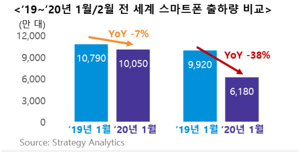 코로나 19의 급속도록 확산되면서 2월 초부터 핸드폰 산업의 생산〮소비 모든 측면에서 악영향을 미칠 것으로 판단됩니다. 우선 중국의 생산 중단으로 글로벌 공급망에 문제가 발생하고 있으며, 코로나 19 이전 5G 활성화를 통해 성장과 회복을 꿈 꾸웠던 스마트폰 시장도 심하게 위축되면서 마이너스 성장이 예상됩니다. 4월 초 세계로 급속하게 전파되면서 소비시장은 더욱 위축되고 말았습니다.