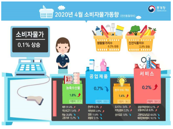 어제 5월 4일 통계청에서 20년 4월 소비자 물가 동향을 보고했습니다. 신종 코로나1 확산 피크였던 4월에 대한 소비자 물가로써 많은 관심을 가졌습니다. 정부에서 '사회적 거리두기'를 시행하면서 학교 개학 연기, 일부 회사의 자택근무, 외식서비스 수요 감소 등으로 소비 줄어든 데다 미국, 러시아, 사우디의 선유국의 폐권전쟁으로 석유류 가격이 큰 폭으로 하락했고 고교 무상교육 실시로 공공서비스 물가까지 하락한 영향으로 전월대비 0.6% 하락, 전년동월대비 0.1% 상승하였습니다.