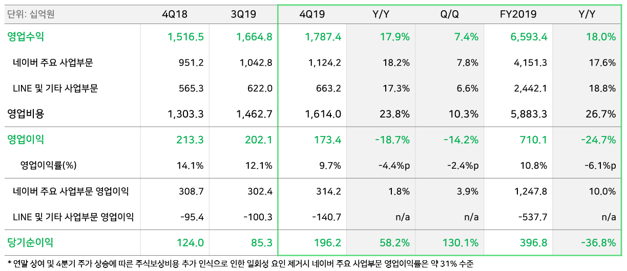 - 영업수익 : 광고 및 비즈니스 플랫폼 매출 호조, 네이버 페이와 웹툰의 고성장 지속에 힘입어 Y/Y 17.9% 증가