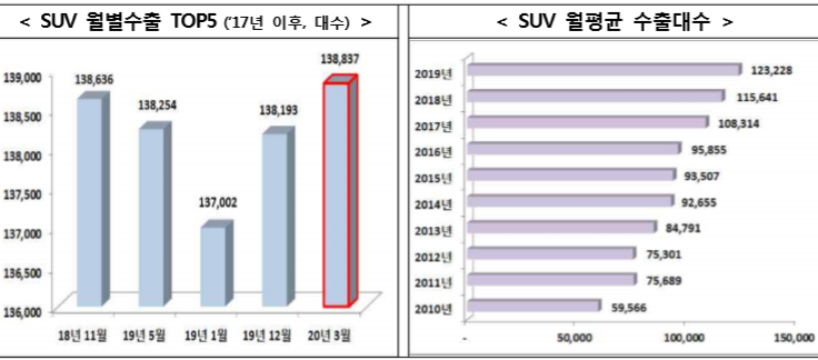 - 특히 SUV는 138,837대(13.2%↑)가 수출되어, ‘16.12월 이후(139,185대) 역대 2번째 수출 최대치 달성