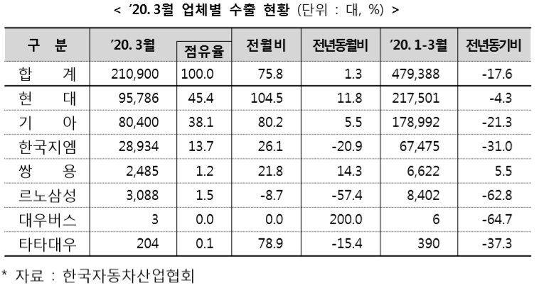 20년 4/13일 산업통산자원부에서 3월 자동차산업 월간 동향을 발표하였습니다.