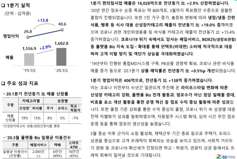 유통업체들의 1분기 실적 발표가 종료된 가운데 유일하게 어닝서프라이즈를 기록한 업체가 바로 GS리테일입니다. 물론 코로나 19 영향으로 인해 외형 성장이 좋지는 못했지만 지난해 4월부터 확인되고 있는 매입률 개선 효과, 편의점 투자비 축소에 따른 감가상각비 감소, 슈퍼마켓 판관비 절감에 따른 이익 개선 등이 성장을 이끌었습니다.