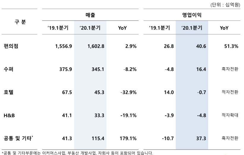 19년 최고 실적을 발표 후 '20년 1분기 편의점 기존점 성장률은 +2.9% 부진했으나 영업이익은 슈퍼마켓의 성과가 좋아서 전반적으로 888억(+674억) 개선하였습니다.