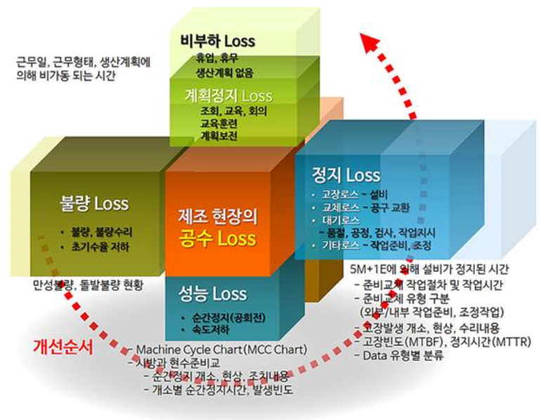 - 제조 현장에서 공수 로스를 개선하는 순서는 비부하 로스를 제외한 불량로스, 성능로스, 정비로스와 계획정지로스를 최소화하여야 함에도 불구하고 생산관리자들은 현장의 공수 로스를 줄이는 개선활동이 어렵고 시간이 많이 소요된다고 합니다.