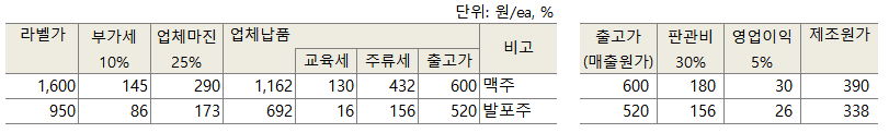 발포주 주류세 : 출고원가 30%, 교육세 : 주세의 10%, 부가세 10%