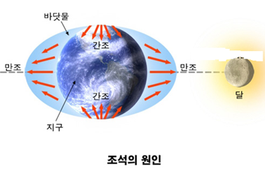- 달·태양 등 천체의 인력작용으로 해면이 1일 2회 주기적으로 오르내리는 현상을 말한다.조석현상을 지구 전체에 대하여 보면, 각각 주기가 12시간 25분(1/2태음일)이 되는 2개의 파장으로 생각할 수 있다. 조석은 지구·태양·달 사이의 인력의 결과 일어나는 비틀림에 의하여 일어난다. 이러한 조석의 원인 , 즉 기조력 원인에는 달뿐만 아니라 태양도 얼마만큼 영향을 끼친다. 달의 인력효과가 지구의 대양에 미친 것과 같이 태양에 대해서도 적용할 수 있다.