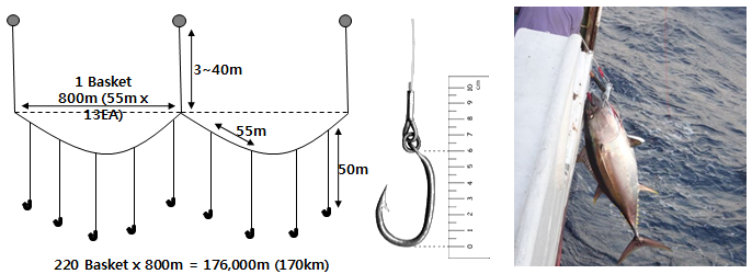 2) 참치 연승은 총 길이 약 150km의 주낙을 통해 횟감으로 사용되는 참치를 어획한다. 횟감용 참치는 품질이 가장 중요한 부분으로 엄격한품질관리 하에 빠른 시간 내에 -60℃이하에서 동결처리 및 보관된다. 참치 연승은 동결 전 최상의 품질을 유지하기 위한 신속한 처리기술이 가장 중요하며, 이에 따라 참치의 맛과 가격이 결정된다. 우리나라의 품질관리 수준은 참치의 종주국인 일본과 대등한 세계 최고수준이다.