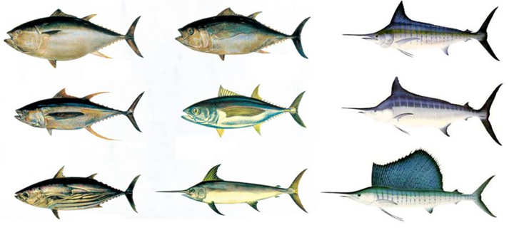 1) True Tuna Species(종) : Albacore(날개다랑어), Southern Bluefin tuna(남방참다랑어), Bigeye tuna(눈다랑어), Pacific Bluefin Tuna(태평양 참다랑어), Atlantic Bluefin Tuna(대서양 참다랑어), Blackfin Tuna(대서양 다랑어), Longtail Tuna(백다랑어), Yellowfin Tuna(황다랑어)