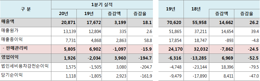 □ 1분기 실적 및 19년,18년 실적분석 (단위: 백만원, %)